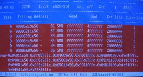 I found a picture of my memcheck experiments on 128MB module. There was so many errors that I wanted to make sure I had copied them all :-) . Memcheck has an option to give error in the form of BadRAM patterns. This is the one shown here. That’s a comma separated list of address,mask couples. In this example, there was so many errors, that I couldn’t use this module, as the kernel would not accept that many arguments at boot time. But I could underclock this 100MHz SDRAM, using it in a slower machine (one that was running 66MHz SDRAM). Memtest confirmed that it would work.