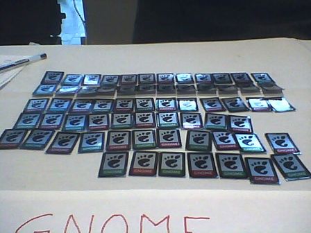 Cette année, pas de T-shirts à vendre, ceux ci sont restés en Suède pour une autre conférence. Mais il nous avons quelques posters, sacs (épuisés), et nos stickers argentés, les bénéfices de ces derniers étant pour GNOME-FR. Nous en sommes à un peu plus de 200 stickers vendus ce week end.